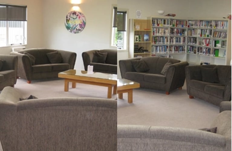 GARDEN LOUNGEOur Garden Lounge is situated beside the Main Kitchen that serves directly into it. It has seven two seater couches surrounding a large coffee table that is completely private via large sliding doors that close it off from the Atrium. Used for multiple purposes such as small gatherings, private meetings, small conferences, one-on-one counselling sessions, or family meetings, this area is ideally suited to everyone. It is beautifully set out to create a pleasant atmosphere. It comes with a wall TV that has cromecast, DVD built in, and is laptop friendly. There is a portable whiteboard for teaching sessions. As an additional bonus, this lounge opens out to a fully fenced area that can be used for children.