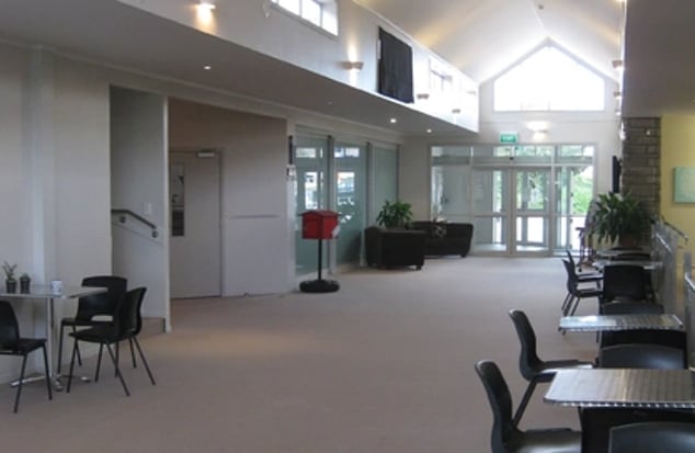 THE ATRIUMAs you enter through the main doors you come into the Atrium. This cafe style area is over 25 meters long and has eight cafe style tables and chairs in place, that is situated between the Auditorium and the Main Kitchen. At the front end of the Atrium are two couches for convenience, with a coffee table between. The area is perfect for setting up tables (provided) for serving food as a buffet, and seating guests or clients for eating, or for holding an audience for a smaller gathering.